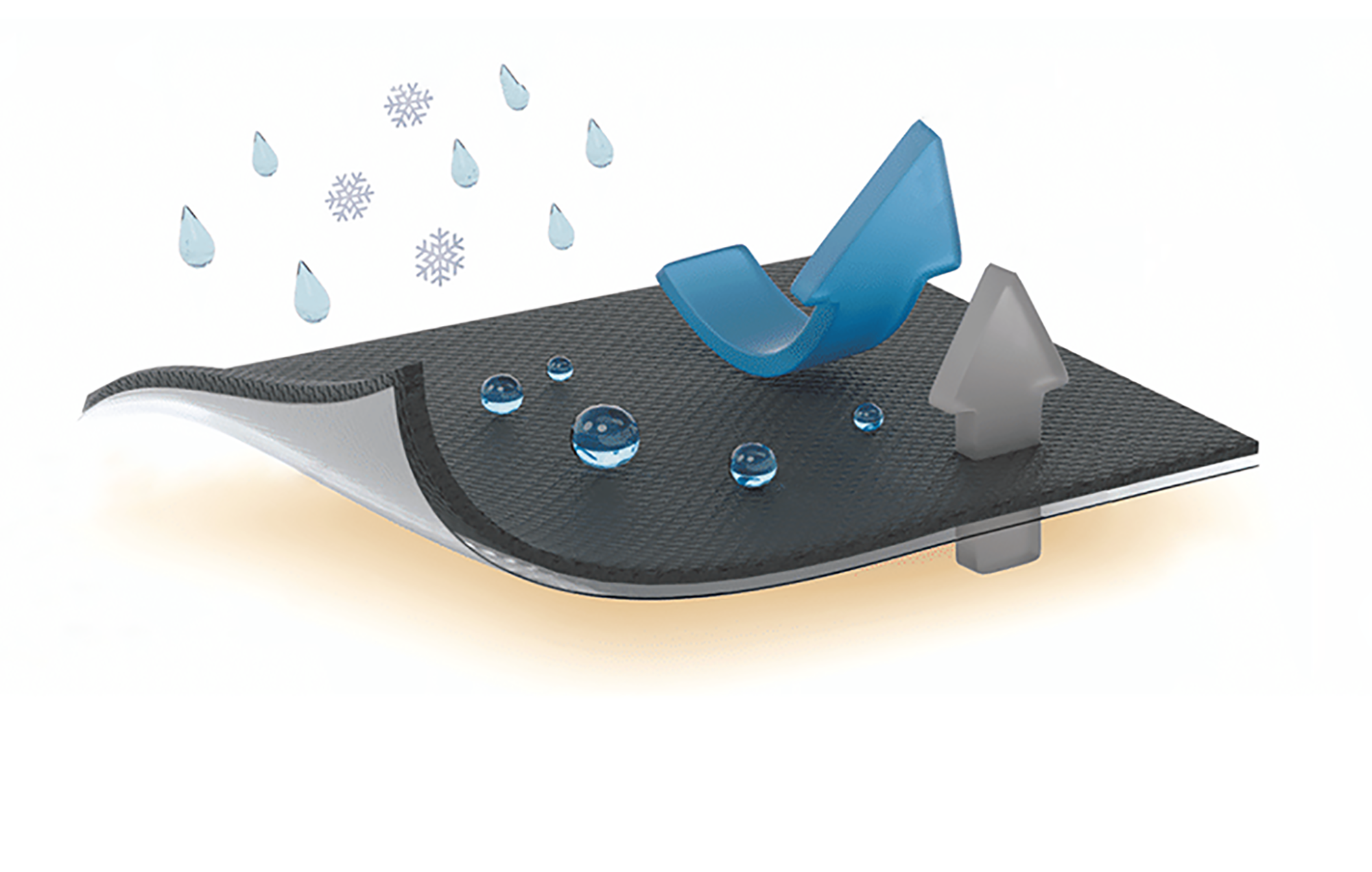 Силиконовый полимер обволакивает каждое волокно тончайшей плёнкой, делая ткань эластичной и устойчивой к истиранию и проникновению воды, позволяя испарениям выходить наружу.